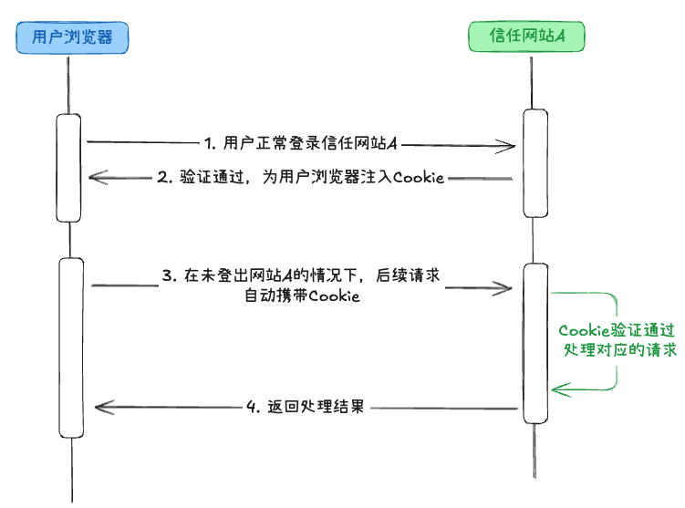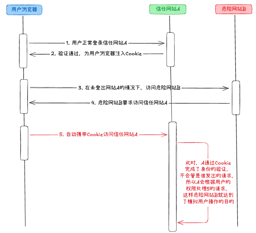 本质矛盾:服务器信任“携带Cookie的请求=用户自愿操作”,但实际可能是恶意诱导的“借刀杀人”。